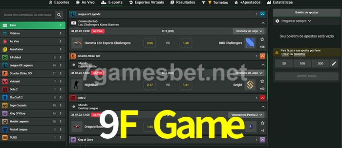 O 9F Game oferece uma grande seleção de opções de apostas em e-sports com probabilidades competitivas